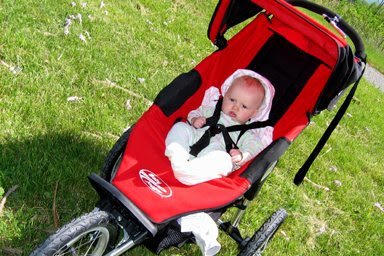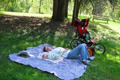 We took N to the arboretum today, to try out the sweet ride given us by M’s now former coworkers: