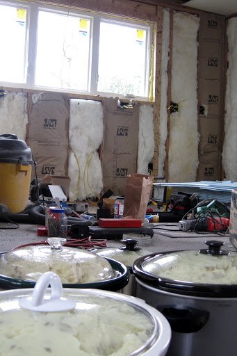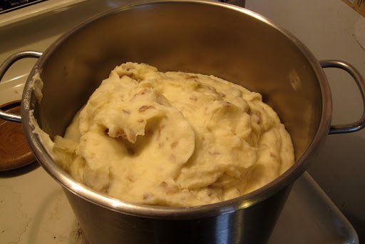 When we tallied up the numbers a week ago, we figured about sixty people would attend–and so prepping food for seventy seemed reasonable. Considering our bumper potato crop, M and I offered to bring mashed potatoes to go along with the gravy, ham, turkey, sweet potatoes, green beans, rolls, cranberry salad, pies, and hot tea and coffee also on the menu.